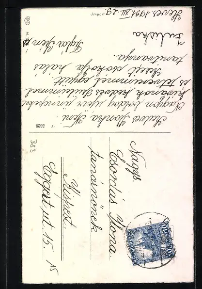Personenbezogene Daten auf der Rückseite der Karte wurden durch blauen Textmarker unkenntlich gemacht. Die blauen Stellen sind auf die Vorderseite durchgeweicht und wirken sich negativ auf das Postkartenfoto aus