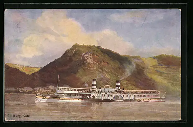 Künstler-AK Burg Katz, Ausflugsdampfer mit Burgblick