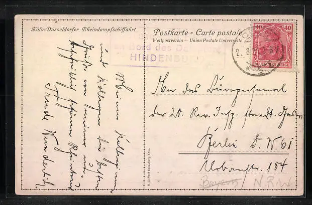 Personenbezogene Daten auf der Rückseite der Karte wurden durch blauen Textmarker unkenntlich gemacht. Die blauen Stellen sind auf die Vorderseite durchgeweicht und wirken sich negativ auf das Postkartenfoto aus