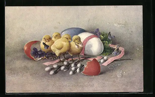 Künstler-AK C. Öhler: Geschlüpfte Osterküken mit Kätzchenzweigen, Ostergruss