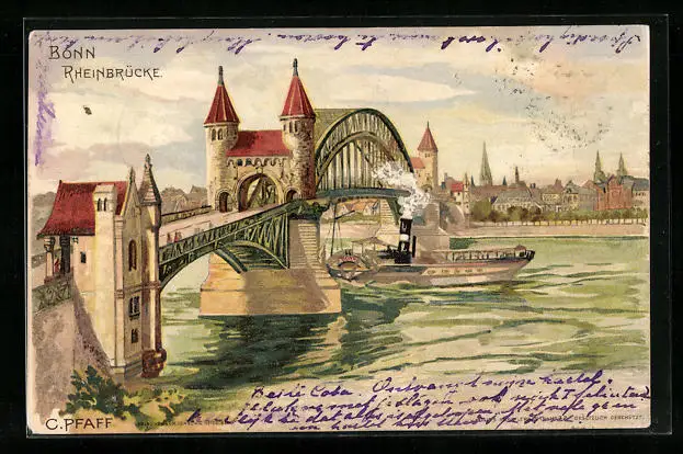 Künstler-AK C. Pfaff: Bonn, Rheinbrücke mit Dampfer