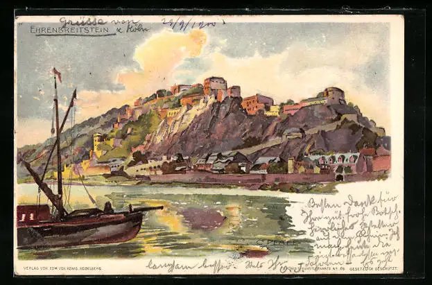 Künstler-AK C. Pfaff: Ehrenbreitstein vom Rhein aus gesehen