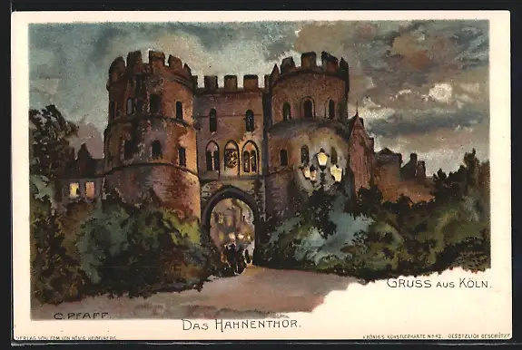 Künstler-AK C. Pfaff: Köln, Hahnentor bei Nacht