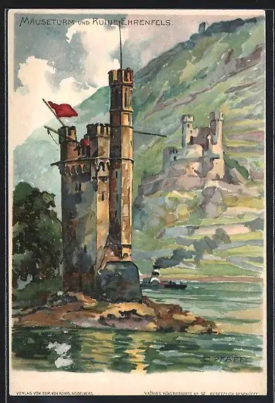 Künstler-AK C. Pfaff: Mäuseturm & Ruine Ehrenfels