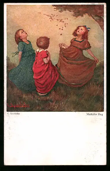 Künstler-AK C. Sporleder: Maikäfer flieg, gebannte Mädchen in bunten Kleidern