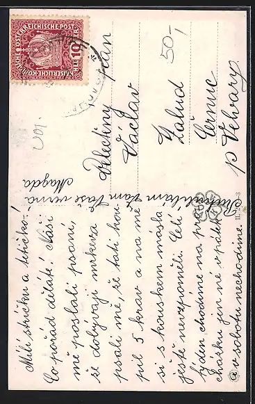 Personenbezogene Daten auf der Rückseite der Karte wurden durch blauen Textmarker unkenntlich gemacht. Die blauen Stellen sind auf die Vorderseite durchgeweicht und wirken sich negativ auf das Postkartenfoto aus