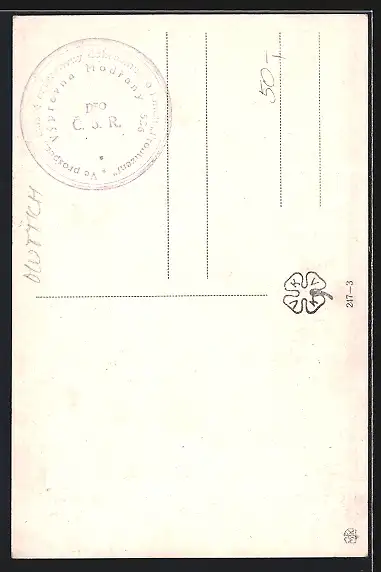 Personenbezogene Daten auf der Rückseite der Karte wurden durch blauen Textmarker unkenntlich gemacht. Die blauen Stellen sind auf die Vorderseite durchgeweicht und wirken sich negativ auf das Postkartenfoto aus