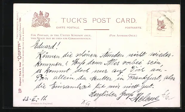 Personenbezogene Daten auf der Rückseite der Karte wurden durch blauen Textmarker unkenntlich gemacht. Die blauen Stellen sind auf die Vorderseite durchgeweicht und wirken sich negativ auf das Postkartenfoto aus