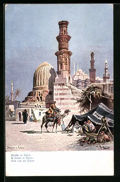 Künstler-AK Cairo, Strassenpartie mit Kamelreiter