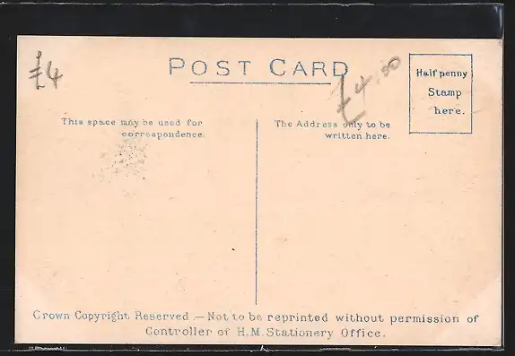 Personenbezogene Daten auf der Rückseite der Karte wurden durch blauen Textmarker unkenntlich gemacht. Die blauen Stellen sind auf die Vorderseite durchgeweicht und wirken sich negativ auf das Postkartenfoto aus