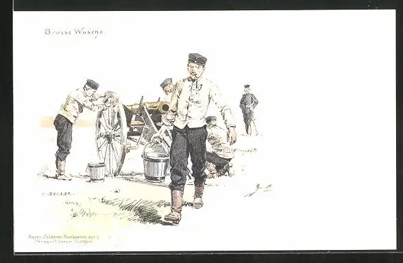Künstler-AK Carl Becker: Grosse Wäsche, Soldaten säubern Kanone