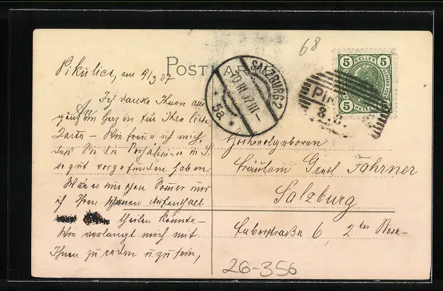 alte Ansichtskarte, gelaufen 1907, Stempelspur, guter Zustand