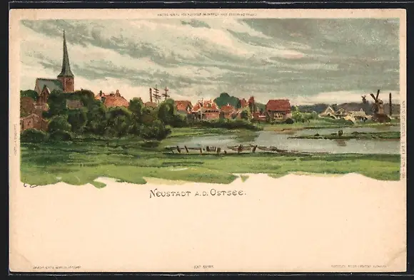 Künstler-AK Carl Biese: Neustadt, Uferpartie mit Blick zum Ort