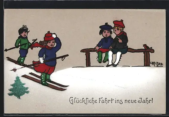 Künstler-AK Carl Diehl: Kinder auf Skiern, Neujahrsgruss