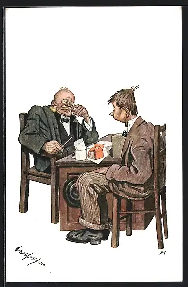 Künstler-AK Carl Josef Pollak: Zwei Männer am Tisch im Gespräch