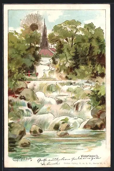 Künstler-AK Carl Münch: Berlin-Kreuzberg, Wasserfall im Victoriapark