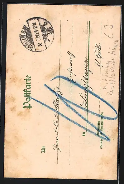 Personenbezogene Daten auf der Rückseite der Karte wurden durch blauen Textmarker unkenntlich gemacht. Die blauen Stellen sind auf die Vorderseite durchgeweicht und wirken sich negativ auf das Postkartenfoto aus