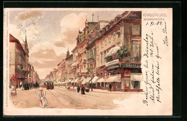 Künstler-AK Carl Münch: Karlsruhe, Kaiserstrasse mit Geschäften und Strassenbahn