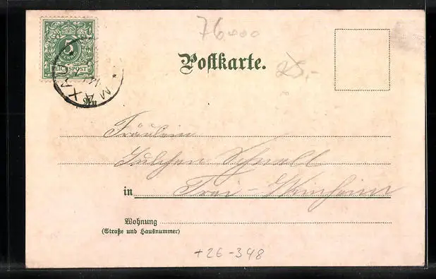 Personenbezogene Daten auf der Rückseite der Karte wurden durch blauen Textmarker unkenntlich gemacht. Die blauen Stellen sind auf die Vorderseite durchgeweicht und wirken sich negativ auf das Postkartenfoto aus