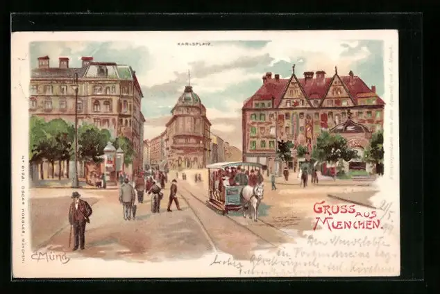 Künstler-AK Carl Münch: München, Pferdebahn auf dem Karlsplatz