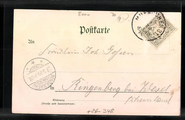 alte Ansichtskarte, gelaufen 1899, Briefmarke tw. entfernt, rückseitig Oberflächenschaden, Stempelspur, guter Zustand