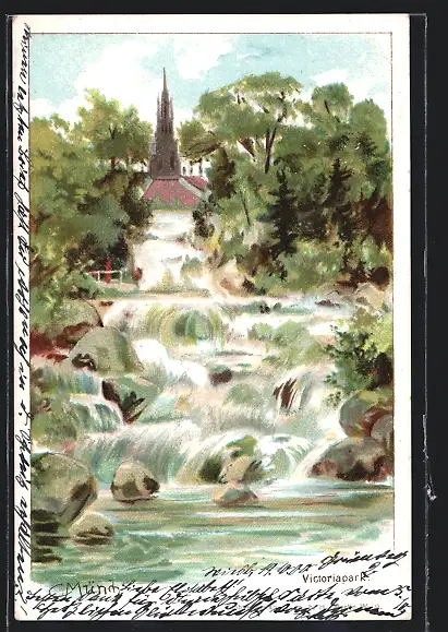 Künstler-AK Carl Münch: Wasserfallidylle im Victoriapark
