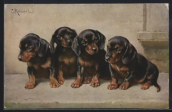 Künstler-AK Carl Reichert: Dackelwelpen in einer Reihe