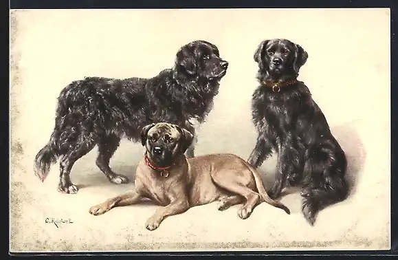 Künstler-AK Carl Reichert: Drei ausgewachsene Labradore mit zotteligem Fell