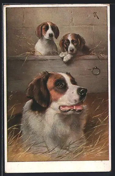 Künstler-AK Carl Reichert: Hund mit Welpen im Stall