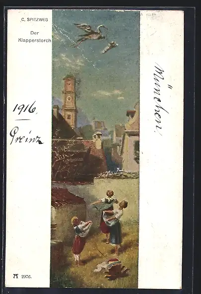 Künstler-AK Carl Spitzweg: Junge Frauen halten dem Klapperstorch ihre Röcke hin