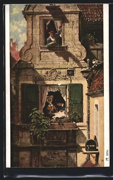 Künstler-AK Carl Spitzweg: Liebespost, Herr lässt einen Brief zu der Dame hinunter