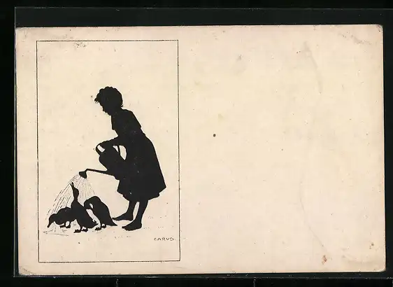 Künstler-AK Carus: Mädchen giesst Enten, Scherenschnitt
