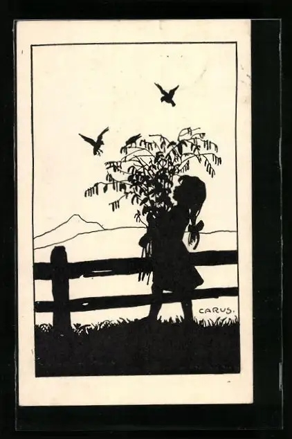 Künstler-AK Carus: Mädchen mit Weidenzweigen am Zaun