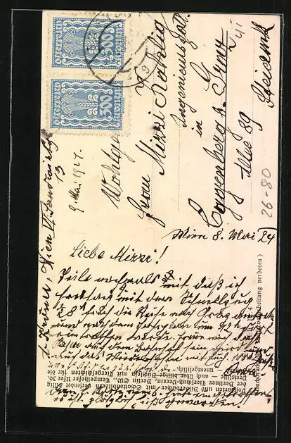 Personenbezogene Daten auf der Rückseite der Karte wurden durch blauen Textmarker unkenntlich gemacht. Die blauen Stellen sind auf die Vorderseite durchgeweicht und wirken sich negativ auf das Postkartenfoto aus