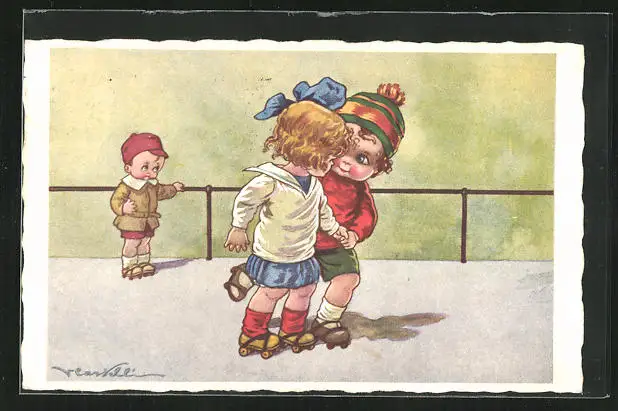 Künstler-AK Castelli: Kinder auf Rollschuhen