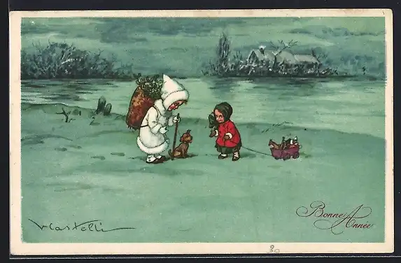 Künstler-AK Castelli: Kinder im Schnee mit Hündchen