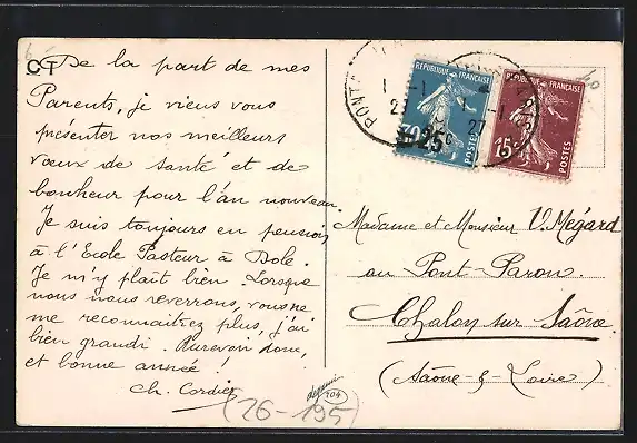 Personenbezogene Daten auf der Rückseite der Karte wurden durch blauen Textmarker unkenntlich gemacht. Die blauen Stellen sind auf die Vorderseite durchgeweicht und wirken sich negativ auf das Postkartenfoto aus