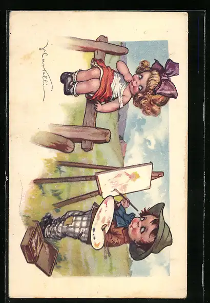 Künstler-AK Castelli: Kleiner Junge an Staffelei malt Mädchen