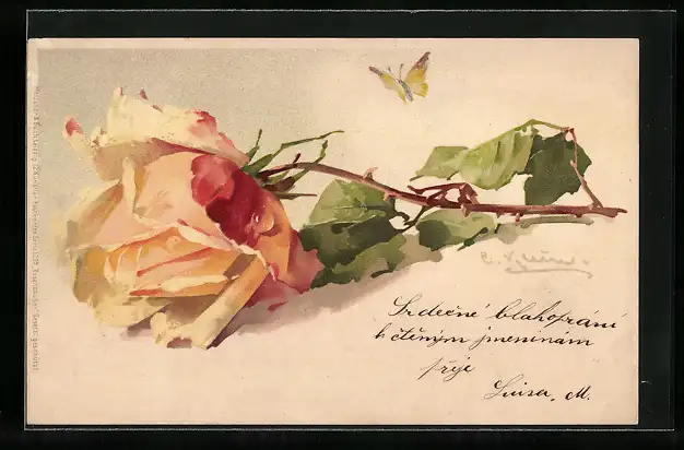 Künstler-AK Catharina Klein: Gelbe Rose mit einem Schmetterling