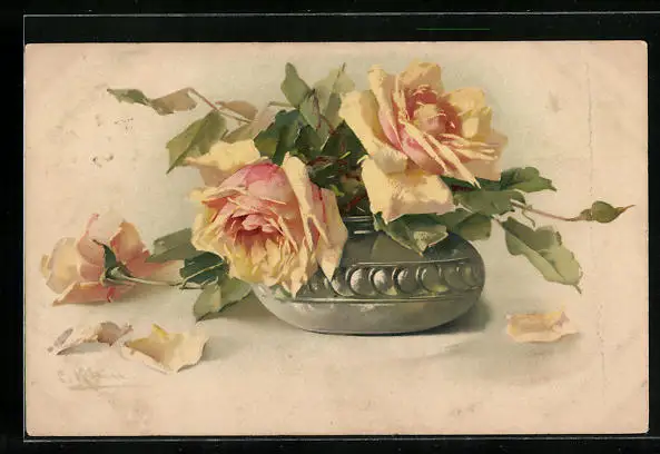 Künstler-AK Catharina Klein: Gelbe Rosen in einer Vase