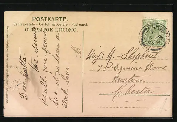 alte Ansichtskarte, gelaufen 1907, Bugspur re. Kante, guter Zustand