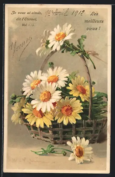 Künstler-AK Catharina Klein: Korb voller Margeriten, Les meilleurs voeux!