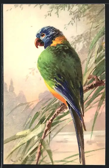 Künstler-AK Catharina Klein: Papagei an einem Fluss
