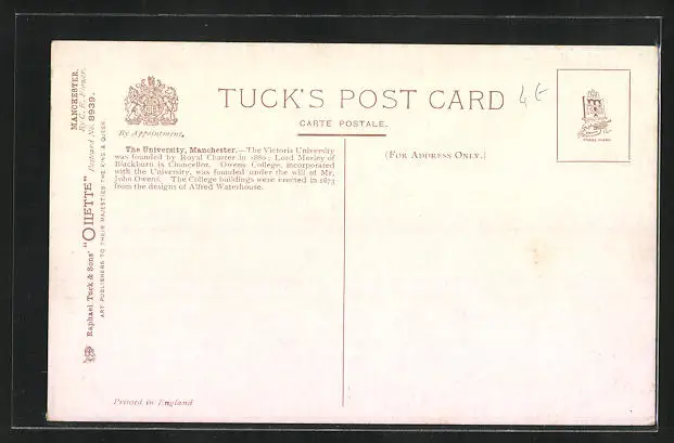 Personenbezogene Daten auf der Rückseite der Karte wurden durch blauen Textmarker unkenntlich gemacht. Die blauen Stellen sind auf die Vorderseite durchgeweicht und wirken sich negativ auf das Postkartenfoto aus