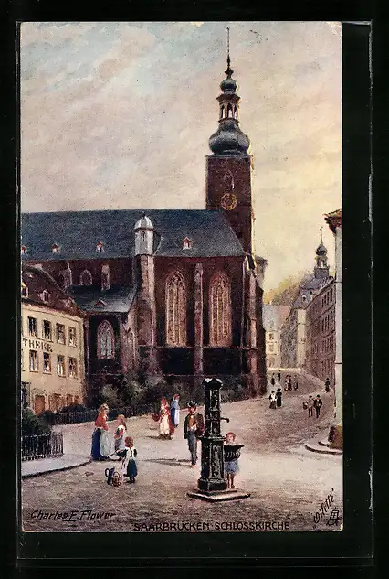 Künstler-AK Charles F. Flower: Saarbrücken, Strassenpartie mit Schlosskirche