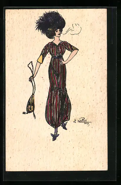 Künstler-AK Charles Naillod: Dame in bunt gestreiftem Kostüm mit Handtasche