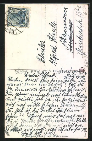Personenbezogene Daten auf der Rückseite der Karte wurden durch blauen Textmarker unkenntlich gemacht. Die blauen Stellen sind auf die Vorderseite durchgeweicht und wirken sich negativ auf das Postkartenfoto aus