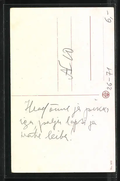 Personenbezogene Daten auf der Rückseite der Karte wurden durch blauen Textmarker unkenntlich gemacht. Die blauen Stellen sind auf die Vorderseite durchgeweicht und wirken sich negativ auf das Postkartenfoto aus