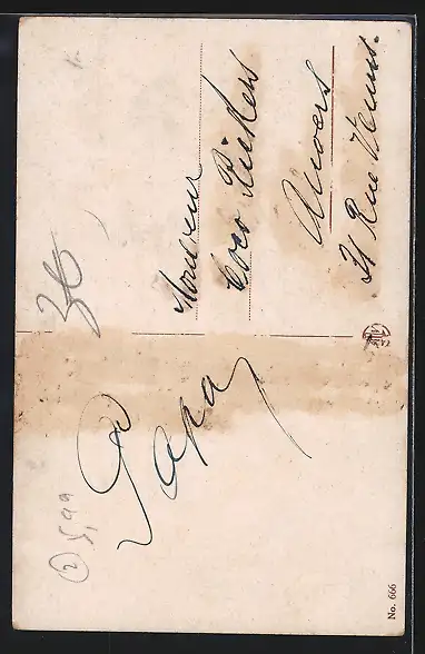 Personenbezogene Daten auf der Rückseite der Karte wurden durch blauen Textmarker unkenntlich gemacht. Die blauen Stellen sind auf die Vorderseite durchgeweicht und wirken sich negativ auf das Postkartenfoto aus