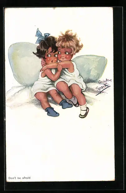 Künstler-AK Chicky Spark: Zwei ängstliche Mädchen im Bett